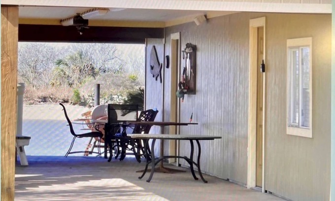 This bunkroom is located underneath the owner’s home. Bunkroom is a room that includes a full bathroom, 2 full/twin bunks. Microwave, Coffee pot, mini fridge and a TV. Includes wifi and satelite. It has a lighted fishing pier. Great space for a fishing trip. Full bathroom with shower. Private entrance and exit from room. There is also the beautiful sunsets over the river. Five minute drive to beach, 5 minute trip to Matagorda town. Dock your boat! Porch with plenty of sitting tables and chairs for a BBQ and relaxation. No more than 4 people and only 1 small dog is allowed.