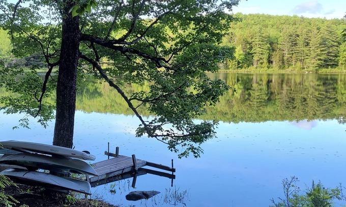 This rustic cabin suits visitors hoping to relax and rejuvenate in a quiet waterfront setting. With 100 ft of private waterfront on Miller pond, you can spend your days enjoying activities on the water, listen to the loons from the firepit in the evening, and have your coffee overlooking Miller Pond from the elevated deck in the mornings. Fish from the dock or use the provided small motor boat, kayaks, canoe, paddleboard. Lifejackets provided and to be worn for any boating or waterfront activities.