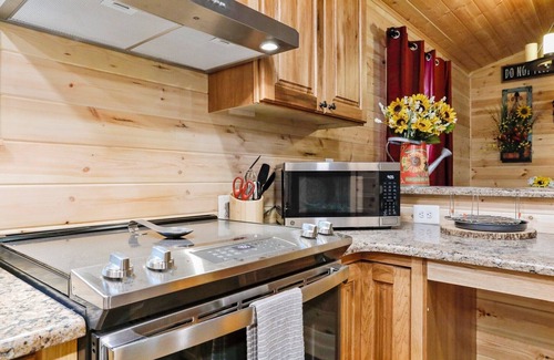 This cabin was built to comply with ADA requirements. This includes ramps, special parking, handicap bathroom, ADA approved appliances, and eating/work areas that accommodate a wheel chair. This cabin offers two bedrooms with a full size bed in each. The family room has a pull out sofa and fireplace for extra sleeping space. There is a dining area which offers a table and bar top dining areas. There is an open floor plan from the kitchen through dining and family room.