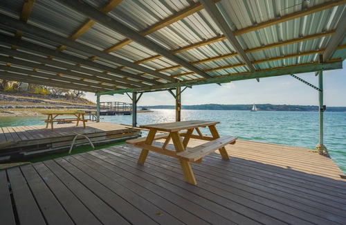 Incredible private lake front property!! Picture perfect sunset views. This property is located in a large, quiet cove on Lake Travis. It has a private dock with picnic tables for guest use! Bring your boat or jet ski and park it over night! There is a public boat ramp (Mansfield Dam - cash or check only) 10 minutes from the house and several boat rental businesses nearby to take advantage of a true lake vacation!
