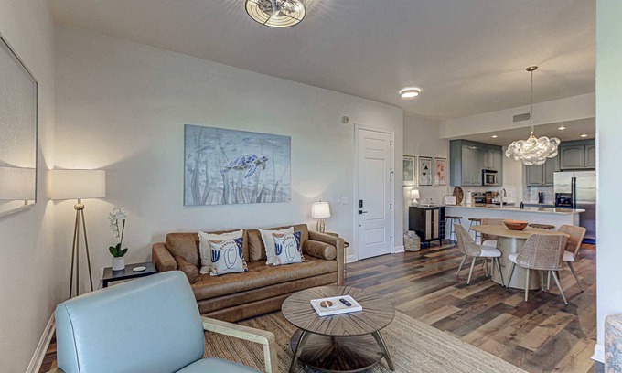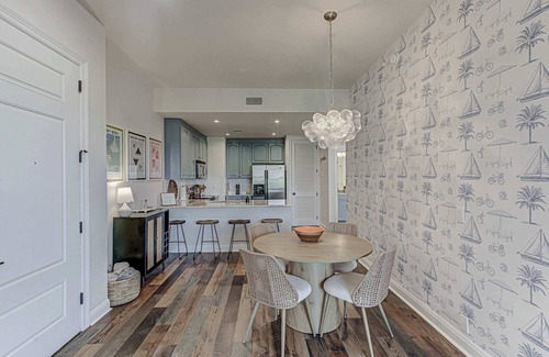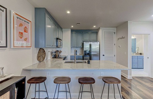 Step inside this bright and open condo and immediately feel at ease. Designed for comfort, the living room features a plush couch, cozy chair, smart TV, and direct balcony access. Slide open the doors and step out to your private balcony with seating for two, where you’ll be treated to breathtaking views of the bay—the perfect spot for morning coffee or sunset cocktails. The kitchen is both stylish and functional, with light blue cabinetry adding a coastal touch, stainless steel appliances, counter seating for four, and a single-cup Keurig for your caffeine fix. A dining table for four makes it easy to enjoy meals in, whether you order in takeout from a local spot or are digging into some home-cooking.