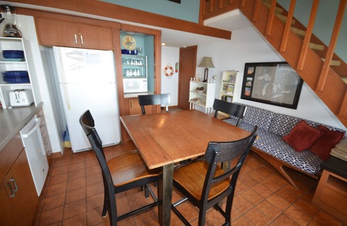 The main floor bedroom has a queen bed and a Murphy bed. The upstairs bedroom has a queen, and the small loft has two twins. There is a full bathroom on each level. The kitchen with breakfast bar overlooks Lake Michigan and the Crystal River.