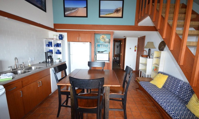 Save big at this waterfront condo on Lake Michigan & the Crystal River! When you walk into the condo you will not believe the beautiful view of Lake Michigan and the Crystal River right out your window. You can even hear the water lapping on the shore. This top floor condo with great sunset views has two bedrooms plus a small loft bedroom and two bathrooms. The condo fits two couples or a family with children well. Not recommended to sleep all adults although that is allowed. Sleeps up to 7.