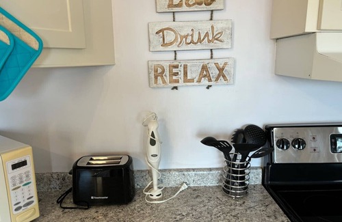 A single, well-appointed bathroom serves both bedrooms, complete with a shower/bathtub. Clean lines and coastal accents enhance the bathroom's ambiance, ensuring a refreshing start or end to your day spent by the water.