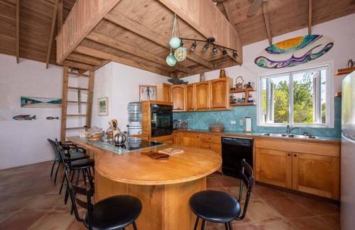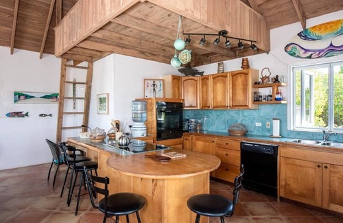 Chez Cay consists of two adjacent buildings. The larger building has a spacious living and dining area with ocean views, and a full well stocked kitchen with electric cook top, oven, dishwasher, big refrigerator and freezer, and a washer & dryer. There is also a sleeping loft with a queen mattress accessible by ladder. This building has one half bath and new air conditioner.
