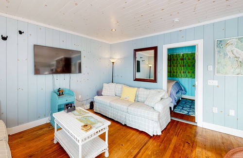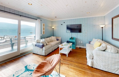 The interior is sunny and breezy, with a rear wall of glass doors that frame the water and open to the deck. Enjoy a well-equipped eat-in kitchen and a living room where you can stream movies via Roku, set up board games, and read in the warmth of the gas fireplace. High-speed WiFi is on hand as well.