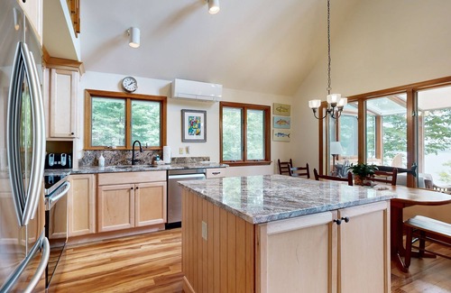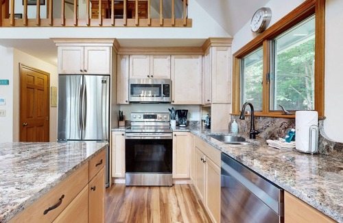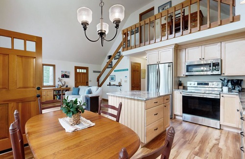 It's a joy to wake up here each morning, as the first rays of sun touch the deck, the sunroom, and the lofty, window-lined living area. It's a natural space for gathering, whether you're cooking on stainless steel kitchen appliances, sitting down for dinner at the dining room table, or streaming movies afterwards. If you're hoping to catch up on a bit of remote work, you'll have a desk in the loft and complimentary high-speed WiFi.