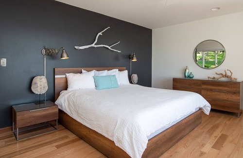 Inside, the Cape Code style home you'll find beautiful knotty pine beams, and modern nautical theme merged together to form the most ideal lakeside retreat. The open galley kitchen is surrounded by windows and is tastefully accented to carry the nautical feel throughout. The cabinets are fully stocked with all your favorite cooking and baking wares. Entertaining is a breeze with a space like this! A formal dining area provides panoramic views while you eat, and you feel as though you are dining alfresco. Completing the entry level you'll find the master bedroom with king size bed, and ensuite bathroom. Upstairs the additional two bedrooms with queen beds have up to date décor. Additional sleeping arrangements include a family room loft with two twin beds, and a queen size pullout couch. All the comfort you will need to enjoy your finger lakes stay.