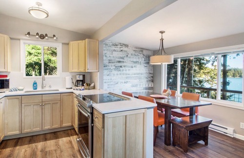 The living room is arranged to maximize the view of Westcott Bay and allow for comfortable gatherings around the electric fireplace. The kitchen and dining room are adjacent to one another, making meals easy and enjoyable for everyone! A wide deck extends the whole length of the house, and offers a dining area, gas BBQ grill and lounge chairs to kick back and enjoy the view. This home does not have Air Conditioning, as the ocean breeze and a few open windows (screened in) are more than sufficient to cool down the home.