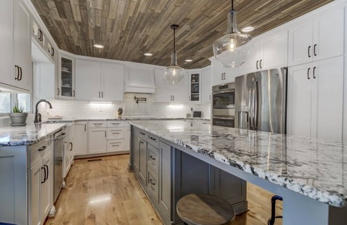 Cooking for a large group will not be a problem with two full kitchens. The main kitchen has new stainless steel appliances, double oven and a 10 foot granite island for gathering. Off the main kitchen is a large screened in porch spanning the whole length of the home for everyone to enjoy lake living at its finest. The walkout basement has another full kitchen and large living space. Including the pool house fridge, there are 3 full size refrigerators and a wine cooler on the property!