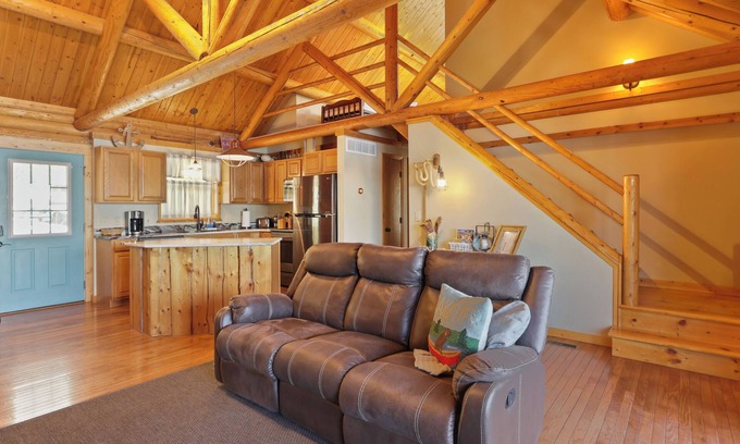 As you step into our log cabin, you'll immediately feel at home with the beautiful exposed wood beams, comfortable furniture, and rustic decor.