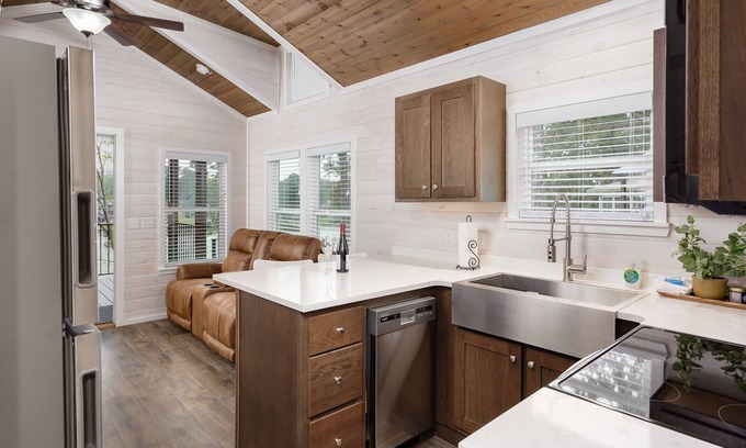 The home may be called a tiny home but offers all the amenities of a full-size home.