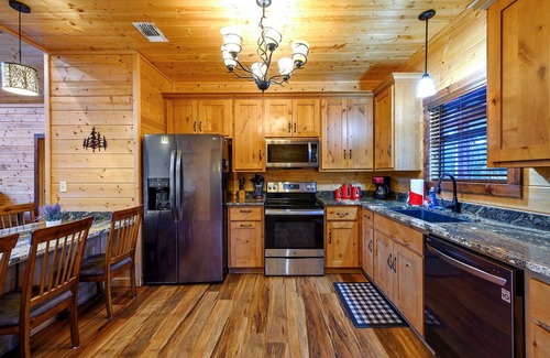 Fox Island is a 5 bedroom 3.5 bath cabin with a large game room that offers what only a few cabins in the area has to offer. Split into two levels, Fox Island is perfectly set up for entertainment and fellowship. Upon entering the cabin on the top level, you walk into the fully stocked kitchen with all the necessities and essentials, with ample countertop space for cooking large meals with your guests. The large and inviting living room leads off the kitchen and offers large floor to ceiling windows overlooking the Mountain Fork River and the private island in which the cabin retrieves its name from, Fox Island. The living room has a gas log fireplace for those cool evenings along the river with a large flat screen television with seating room for everyone. Off of the main family room is a spacious balcony overlooking the back of the property and the calming sounds of the river.