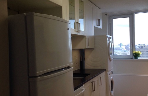 This suite is located in the heart of Ottawa Gatineau Area, 10-min walk to Byward Market and 15-min walk to parliament hill. The stunning waterfront view of the suite would take your breath away. 900-square feet with all furnished and newly renovation kitchen, bathroom with marble flooring , all floors with different materials (wood, ceramic and marble) are installed in the condo. All furnished bedroom with Cream Leather bedframes (Sleep Country) and mattresses ( BeautyRest). The simple glass top with stainless steel dinning table is accompanied with 2 dinning chairs. The washroom has been lavished with a patterned ceramic European Style wall. In the kitchen, there are plentiful closet spaces with fridge as well as stove. The newly purchased sofa which can be turned into a double-size sofa bed (with comfortable mattress from The Bay Department Store) also gives a sleek look of the modern style, which enables to sleep 2 people.