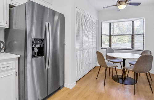 The home is divided into separate living spaces, each featuring a two-bedroom layout equipped for standalone comfort. Both interiors come fully updated throughout, with matching furniture and decor. Each space is equipped with home essentials, including a stainless steel full kitchen, central air-conditioning, and a private washer/dryer. Both living rooms are equipped with a smart TV, offering casual downtime entertainment in between group outings. One duplex offers extra sleeping space with an air-conditioned bonus room that features a sleeper sofa.