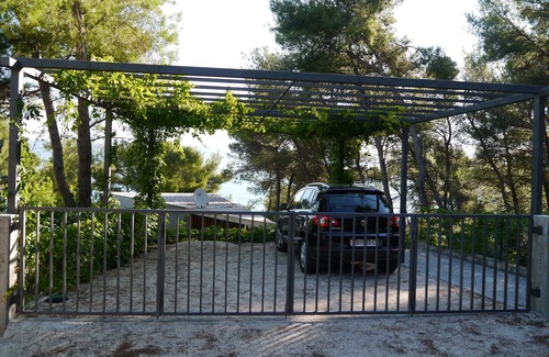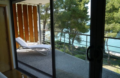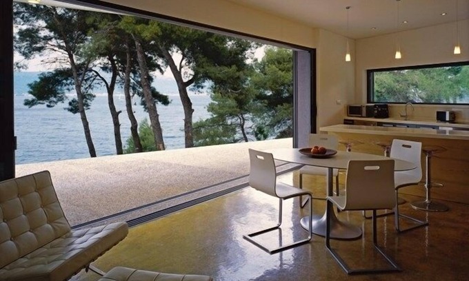 SELECTED AS 1 OF 5 PRETTIEST HOUSES IN DALMATIA. This award winning villa is set back from the street to afford privacy & provides a carefully designed entry in complete harmony with its setting by the sea. It is tucked into the existing pine trees vegetation of a gently sloping triangular lot. Aligned on the n/s axis, the villa offers panoramic view of the sea & direct access to the beach through a typical Med. garden. There is simplicity in the plan of the house which is focused on indoor-outdoor living. Beautiful garden & open sea view meet a 6 m long sliding door linking interior with exterior. Concrete stairs compliment with rich & soft materials: epoxy floors, maple cabinetry & walls, teak railings, engineer stone countertops & designed furniture. Dining & living spaces spill onto broad terrace with sweeping view of the sea. It is an ideal place to enjoy the sea thanks to the jetty, natural stone beach in front of the house & beautiful pebble beach 100m away. *Internet access*