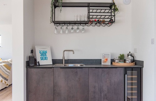 Large open plan living room with magnificent views of the beach and sea over the garden, with two three seater sofas, armchairs, floor cushions. Large Smart screen TV. Corner breakfast table and seating for 6. Bar area, with fridge, sink and glassware.