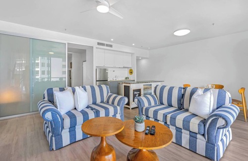 As you enter your apartment, you'll be greeted by sun-drenched open living and central air-conditioning throughout, ensuring you remain comfortable no matter the weather. The apartment features a spacious living area, complete with a fully-equipped kitchen so you can cook meals at home. Step out onto your private balcony and take in scenic views of the Cairns inlet and city skyline. It's the perfect spot to enjoy your morning coffee or unwind after a long day of exploring.