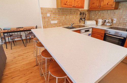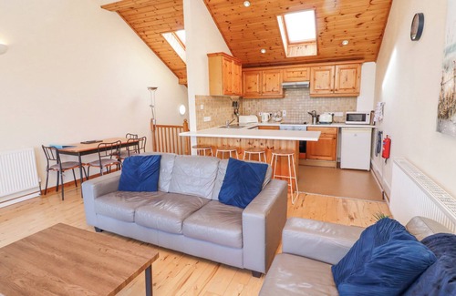 Waters Edge, a reverse-level abode, consists of an open-plan living space including a kitchen with an oven, grill, hob, microwave, fridge, freezer, dishwasher, washing machine, a dining area, and a sitting area with balcony and furniture. The bedrooms consist of a king-size and two singles, serviced by a bathroom. Outside, there is a communal garden with lawn as well as designated parking for one car and additional parking for two cars. Two well-behaved dogs welcome, but sorry, no smoking. Shop and pub 0.1 mile, beach 0.6 miles. WiFi, fuel, power, bed linen and towels inc. in rent. Waters Edge, a base to relax and rejuvenate. Note: This property only accepts Saturday changeovers.