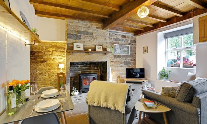 A beautiful characterful cottage in a peaceful location next to the river in the heart of Holmfirth and is the perfect place to relax and a short stroll to independent shops, bakeries, bars and restaurants. There’s plenty to do with popular folk, art, film, food festivals or why not book a wine tasting tour of Holmfirth Vineyard or catch a gig at the Picture Drome. Also a walking and cycling enthusiast's paradise with the Peak District National Park, Pennine Way and moorland on your doorstep. Guests can enjoy a comfy kingsize bed with ensuite bathroom including electric shower. Fully equipped vaulted ceiling kitchen including washing machine and fridge freezer. Living room is flagged with beams galore and exposed stone walls. We have used quality fixtures and fittings and decorated in an eclectic style which we hope has something for everybody. Cottage location is peaceful and private with a patioed sitting out area perfect for reading, relaxing and alfresco eating and drinking accompanied by the sound of the river