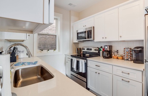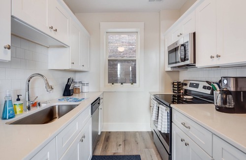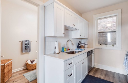 This cozy 3-bedroom (Queen beds) 2-bathroom apartment offers a stylishly renovated interior with a kitchen boasting plenty of amenities for culinary adventures. The living room provides a charming view of the lake, ensuring tranquil mornings and a cozy ambiance. Three Smart TV's are available for you to stream using your accounts. Free onsite parking behind the deck adds convenience to your stay. Please park on the far right so that our retail tenant can park in the two spots to the left of you.