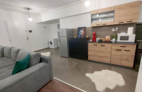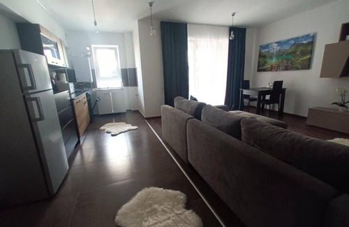 We cordially invite you to a spacious and welcoming apartment, located in an exceptional location in Brașov. Here you will discover an inviting bedroom with a private balcony, a generous living room that opens onto a terrace, a minimalist kitchen, and a fully equipped bathroom. We ensure that you will have a pleasant and comfortable stay in this location. The living room is carefully furnished, and the sofa can be transformed into an additional bed, providing you with the possibility of a restful sleep. The bathroom is thoughtfully equipped, providing you with shower gel, liquid hand soap, soft towels, and a hairdryer for your comfort and daily hygiene. The spacious terrace offers picturesque views of Mount Tâmpa and the inner courtyard of the complex, making it a perfect place to relax and admire the beauty of the surrounding landscape. The bedroom allows you access to a balcony, where you can savor moments of peace and contemplation. The apartment is located in an exceptional location, a short distance from the pedestrian crossing to the Coresi mall, providing you with easy access to a wide range of facilities. Nearby, there is a bus station, and in the area, you will find renowned places such as the Sergiana restaurant and Starbucks. Additionally, you will benefit from the proximity of a McDonald's restaurant and reliable supermarkets such as Auchan, Kaufland, and Lidl. For your comfort and safety, we provide private parking. We look forward to welcoming you to this apartment!