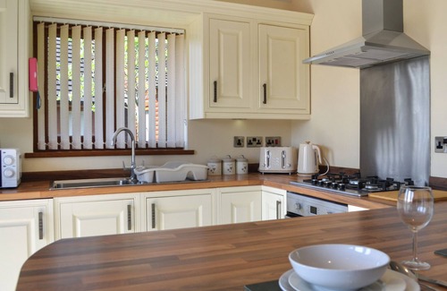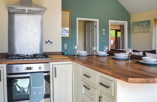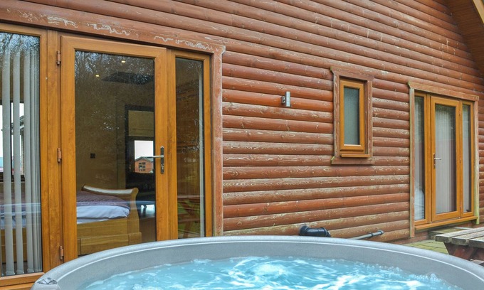 Bedroom 2: Kingsize (5ft) Bed, Patio Doors Leading To Garden Ensuite: Bath With Shower Over, Toilet. Gas central heating, electricity, bed linen, towels and Wi-Fi included. Travel cot and highchair. Back garden with sitting out area and garden furniture. Grounds (shared with other properties on-site). Hot tub for 4 (private). Fishing on-site (at cost). Private parking for 2 cars. No smoking. Please note: There is a step in the garden, and a lake in the grounds.. Jasmine Lodge at Westfield Country Park is a charming and comfortable retreat for up to four guests. This well-designed lodge features an open plan living area with deep filled sofas, a Smart TV, and an electric fire, creating a cosy atmosphere to relax in after days spent exploring the area. The stylish shaker-style kitchen is fully equipped with a gas hob, electric oven, washing machine, and breakfast bar seating for four. Large feature windows fill the space with natural light. The two bedrooms, one kingsize and one super kingsize, each have en-suite bathrooms with a choice of bath or shower and doors leading out to the enclosed garden. Outside, enjoy a private hot tub.