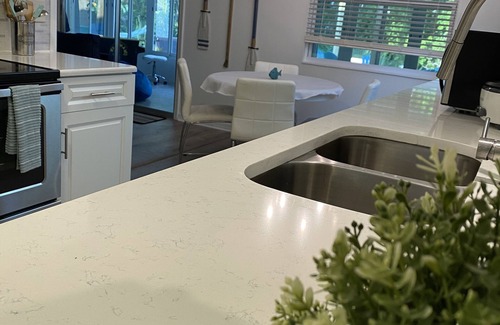 The Deja Blue River Beach House has two beautifully updated bathrooms that will make you feel right at home. The first bathroom is located in the hallway and features quartz countertops and an upgraded tub and shower, all complemented by calming powder blue walls. The second bathroom is located in the second bedroom and boasts double sinks, a large mirror, and ample storage space. It also has a luxurious walk-in shower that will leave you feeling refreshed and revitalized.