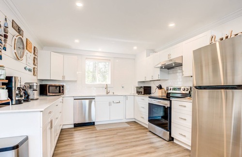 As you enter the cottage, you are greeted to an open space - a beautiful, gleaming kitchen and living room. Just next to the kitchen, you will find a dining table capable of seating 6 people. The living room includes a comfy sectional sofa, fireplace and a Smart TV with unlimited Wi-Fi . The kitchen is fully-equipped (with a dishwasher) and includes all of the necessary utensils and accessories to make a large family meal for the group. Inside of hallway closet you will find numerous board games to keep the fun going.
