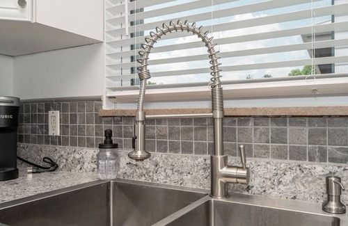 Further inside, the fully equipped kitchen includes stainless steel appliances, coffee maker, and cookware for convenient meals at home, which can be shared at the dining table for 4.