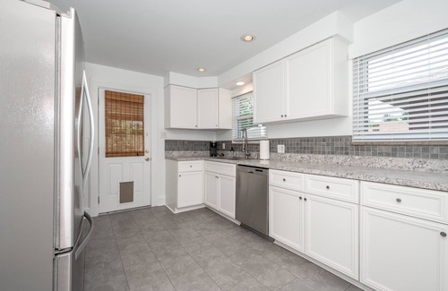 Entering the home’s front door, you’ll be greeted by the modern living area decorated with calming neutral tones. The perfect place to relax and unwind, a sectional couch faces the large smart tv where you can stream movies and shows on YouTube TV or your personal streaming accounts. A brightly lit alcove is furnished with desk and chair, so work-from-home travelers have a semi-private space to take meetings and complete projects.