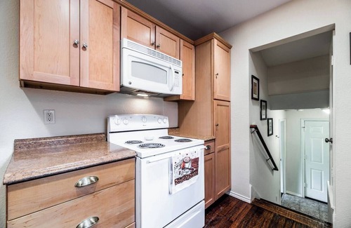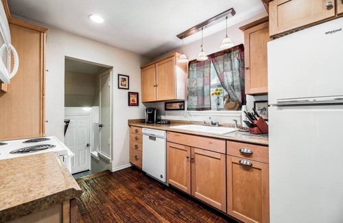 Our home itself has a nice, private split layout with the Master on a slightly lower level (a few steps down) on one side of the home and the second bedroom on the other side. The shared bathroom is in the middle, as are the common areas: the living room, galley-style kitchen, and dining room. All of our spaces have been staged with your comfort and convenience in mind.