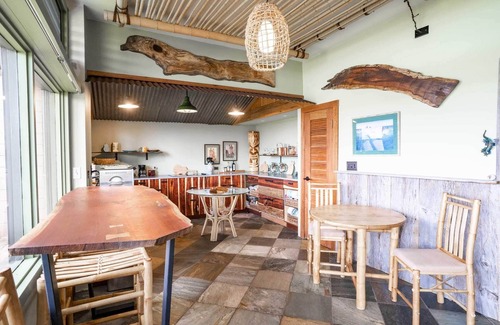 Returning to the entry to unload groceries in the kitchen you'll find monkey pod cabinets with zinc countertops. Live edge shelves offer unique character along with the rusted tin ceiling sending a beach-shack vibe.