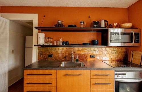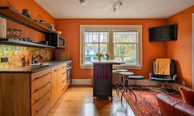 There are custom and artistic touches throughout the space. The front porch offers a pleasant sanctuary overlooking the boulevard: perfect for morning coffee or evening cocktails. The TV includes a Firestick so you can easily log into your personal steaming accounts. Owners live and work onsite, happy to respond to any questions.