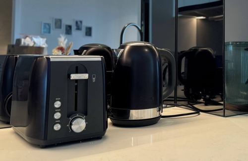 • Our modern, fully-equipped kitchen includes a gas cooktop, island bench, refrigerator, dishwasher, microwave, oven, toaster, and kettle—everything you need for cooking and dining.
