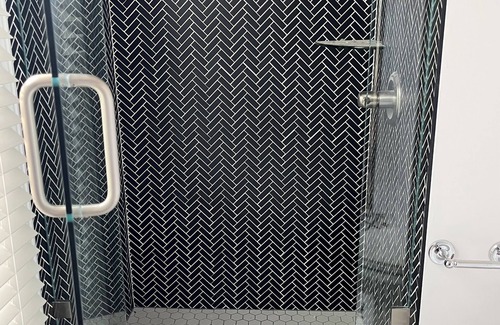 - Marble bath with glass-enclosed shower