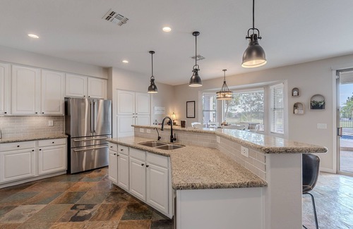 Our spacious 4 king bedroom & 3 bath getaway on the golf course is perfect for families, groups, or anyone wanting a mix of fun and relaxation. Cook together in the chef like kitchen, unwind in the cozy living room, or enjoy endless backyard entertainment with a pool, hot tub, and games.