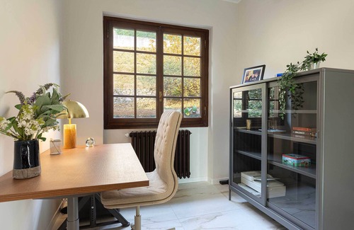 The garden (3200 m²) grows on the sloping hill surrounding the house, offering a variety of vantage points for taking in the views of the lake and Angera's castle "La Rocca”. The swimming pool is the perfect haven on warm summer days and is flanked by a covered patio with sunloungers and poufs.