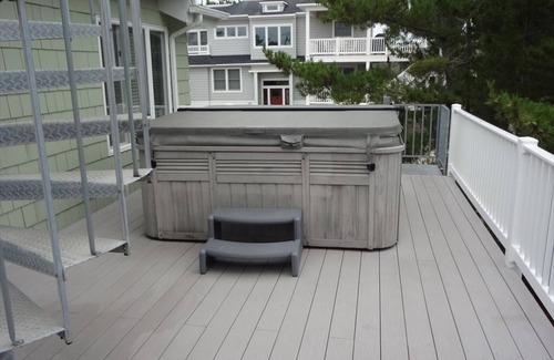 Step outside to enjoy the fresh ocean air on one of the two decks or relax in the roof top hot tub after a day at the beach. Additional features include a garage, parking for 3 vehicles, cable TV, high-speed internet, and beach equipment for your convenience.