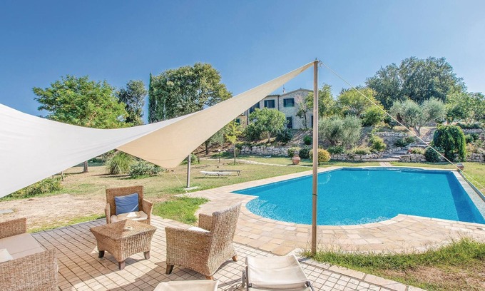 Well-maintained and elegant part of a two-family house with extensive garden and pool, about 10 km from the beautiful city of Orvieto. The property is situated in a dominant position on a gentle hill overlooking a valley and consists of two parts of the house, one of which is occupied by the English owner. The two parts of the house are symmetrical and have access and views on opposite and completely independent sides. At guests' disposal: private, large and equipped outdoor area, communal pool in the green. In summer, the area of Orvieto hosts önogastronomic village festivals and musical events. The vacation home has kept its traditional rural style and part of the furnishings are by a well-known craftsman from the area. Parking on the property, good privacy and tranquility. Distance: the Corbara lake with river park on the Tiber (possibility of excursions and canoeing) 6 km, Orvieto 10 km, Todi and Lake Bolsena 28 km, Viterbo and its thermal baths 41 km.