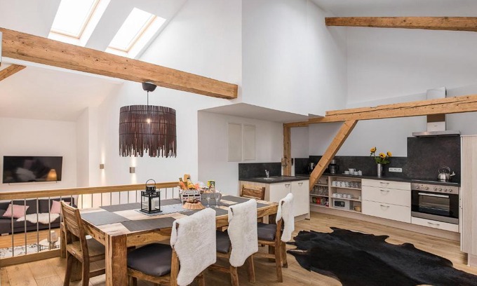 Food & DrinkChocolate/Cookies, Bottle of water, Tea/Coffee makerBathroomTowels, Private bathroom, Shower, Free toiletries, Toilet paper, Body soap, Toilet, Bathtub or shower, HairdryerMedia & TechnologyFlat-screen TV, Streaming service (like Netflix), TVKitchenKitchen, Toaster, Coffee machine, Refrigerator, Dishwasher, Electric kettle, Kitchenette, Kitchenware, High chair, Dining table, Stovetop, Wine glassesLiving AreaDining area, Sofa, Sitting areaOutdoorsPatioGeneralSoundproof, Hardwood or parquet floors, Key access, Heating, Smoke Alarm, Trash cansViewView, Quiet street view, Mountain view, Garden viewActivitiesSaunaBedroomLinens, Wardrobe or closetAccessibilityUpper floors accessible by stairs onlyBuilding CharacteristicsPrivate apartment in buildingRoom AmenitiesFeather pillow, Socket near the bed, Clothes rack, Sofa bed |