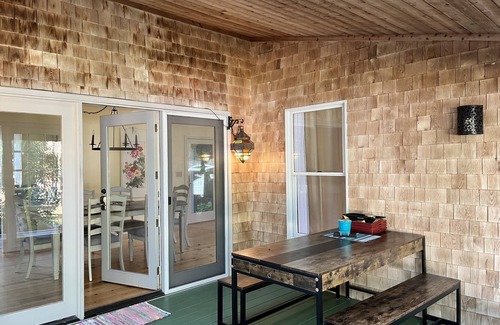 Step outside to the screened-in porch off the kitchen for morning coffee, afternoon snacks, or evening games. The private deck features a gas grill, fire pit, and an outdoor shower—perfect for summer nights and stargazing in the backyard.