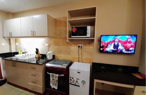 West Suites studio apartments are located in Nairobi West, Kisauni Rd. The apartment has a modern open plan concept design with a lounge area with study desk & laptop friendly workspace, bed area with in-built cupboards, spacious kitchenette equipped with cookware, dishware, utensils, microwave, gas cooker and fridge, a flat-screen Smart TV with inbuilt decoder and multimedia connectivity support, large windows that allow plenty of natural light & an ensuite bathroom with luxury fittings.