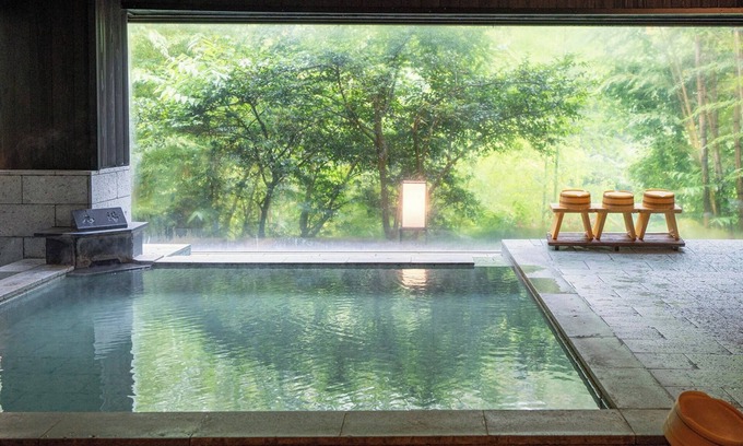 Private openair bath and family bath are free of charge Special Kuroge Wagyu beef and black pork kaiseki course meals and carefully selected sake A relaxing trip surrounded by nature / Enjoy the smooth quality of the sulfur spring water in the private openair bath with the lush natural forest of Kurikawa Onsen right in front of you Free yourself from the hustle and bustle of everyday life and enjoy a relaxing and healing time this is the true joy of a hot spring trip
