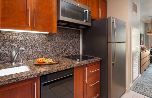 The fully equipped kitchen area features a range and oven, along with a full-size refrigerator, toaster, blender, sink, and dishwasher and all the necessary cookware and dinnerware.