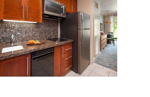 The studio is approximately 510 square feet. It has a king size bed and a queen size sleeper-sofa. The bathroom has a shower, separate tub and single sink vanity. There is a kitchenette with a full size refrigerator, microwave, cooktop, dishwasher, cookware and dinnerware.