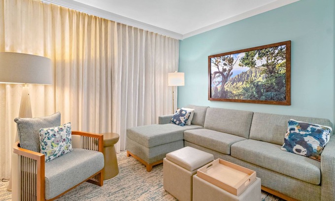 Boasting 800 sq ft of luxurious living area, this one-bedroom villa boasts an elegant island design complemented by its modern finishes and comfortable furnishings. With a king-size bed in the primary bedroom and a queen-size sofa sleeper in the living area, this suite can comfortably sleep up to four guests. Its luxurious bathroom features a granite vanity along with an elegantly tiled shower and jetted tub.