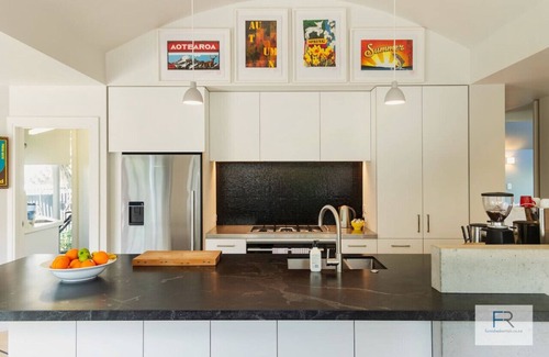 This bright and airy single level home comprises a master bedroom with king bed and ensuite, two further double bedrooms, one king single bedroom and main bathroom. The living area is open plan with a modern fully equipped kitchen, two living spaces, indoor dining (seats 7) and outdoor dining (seats 10), office, and separate laundry.