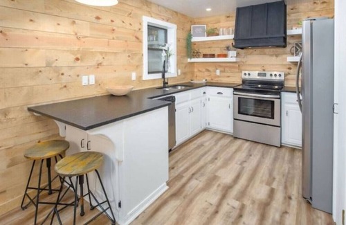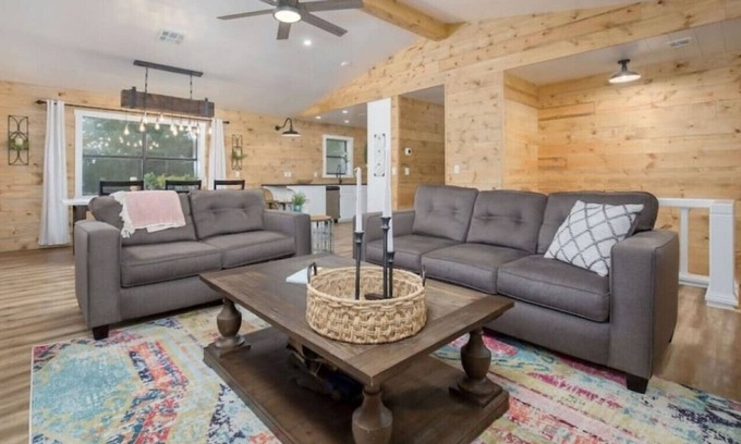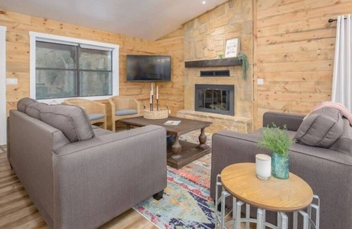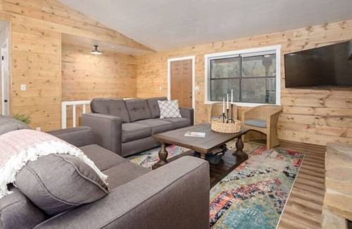 Something for everyone at this newly remodeled cabin next to Lake of the Arbuckles. This enchanted remodel is the perfect weekend getaway. The inside is bright and fresh, perfect to enjoy time with friends and family. The outside is secluded and peaceful, with room to play or gather around a cozy fire. 3 bedrooms, one of which is a large bunk room with custom built bunk beds. Sleeps two families up to 10 people (with children and adults mix)