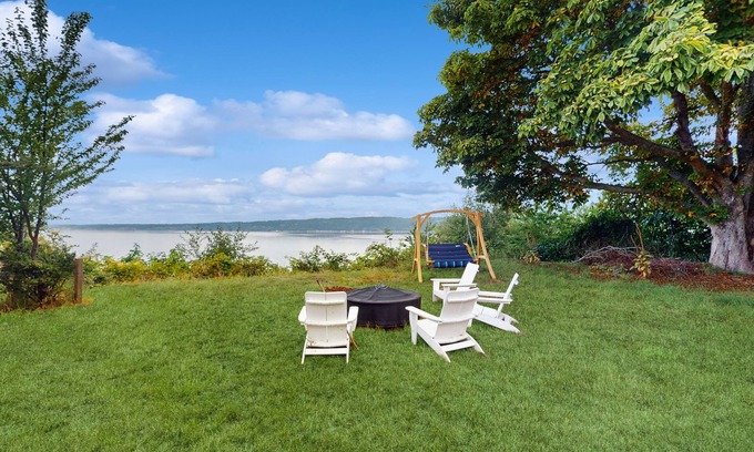Step back in time with this artistic 1940s charmer, a whimsical getaway perched above the Salish Sea. From the porch, you’ll enjoy sweeping views of Saratoga Passage and the Cascade Mountains, with whales, eagles, and passing boats often putting on a show right outside your door.